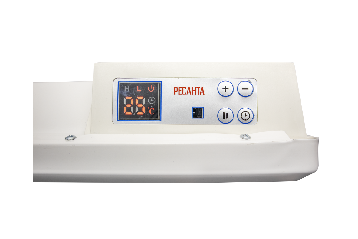 Блок управления расположен на корпусе сверху. На LED-дисплее отображается текущая температура в комнате. Задать желаемую температуру можно с точностью до градуса при помощи кнопок на панели. Датчик электронного термостата закреплен у нижних заборных отверстий. Он фиксирует температуру входящего воздуха и, если он слишком холодный, автоматически включает нагрев. Также можно настроить работу электроконвектора по таймеру. Реализована функция защиты дома от вымораживания - поддержание тепла на уровне +15 градусов.