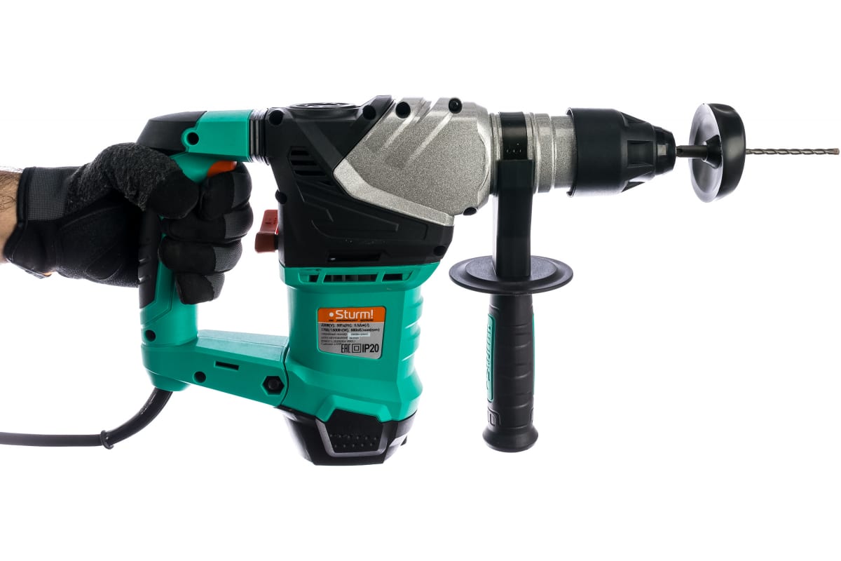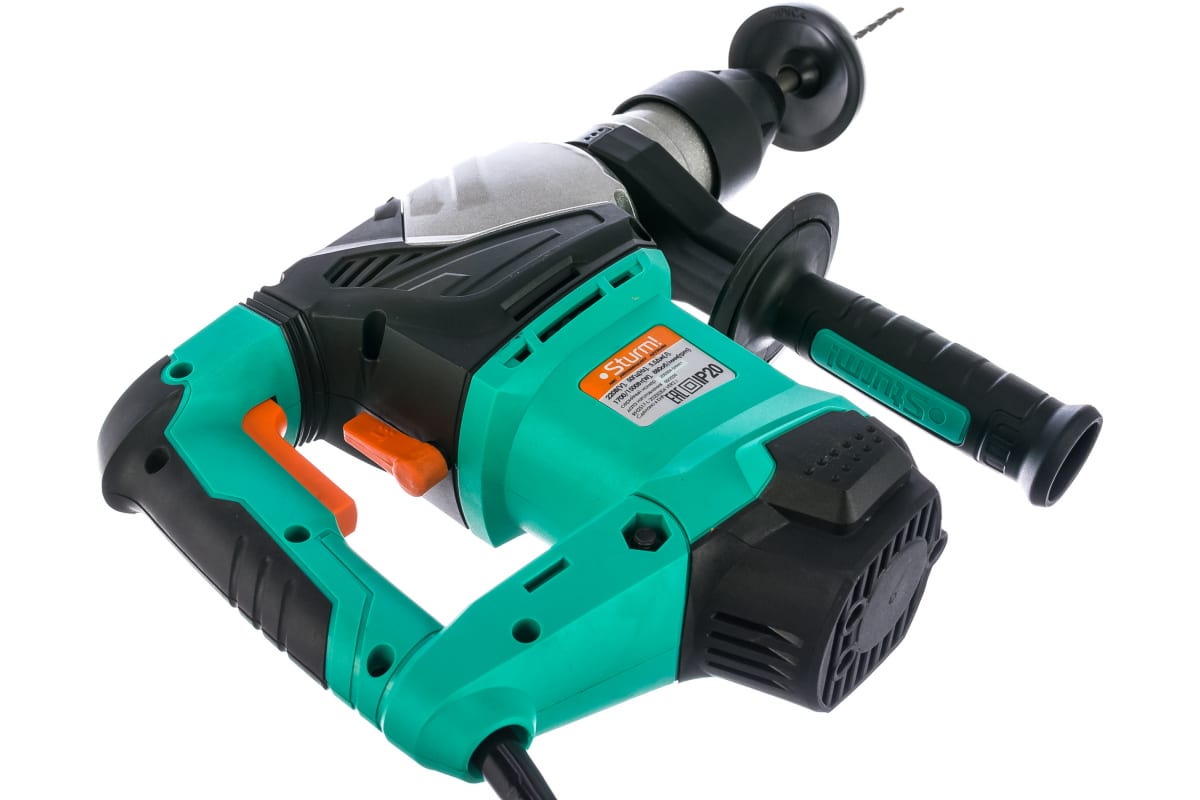 Sturm RH2517 – универсальный и производительный трехрежимный перфоратор. Являясь представителем семейства перфораторов вертикальной компоновки инструмент воплощает в себе все основные, присущие компоновке этого типа достоинства – возможность установки мощного двигателя при сохранении компактных габаритных размеров устройства, нейтральный центр тяжести, способность выдерживать повышенные нагрузки ¬Модель Sturm RH2517 оснащена производительным 1700 - ваттным электромотором с дополнительным бронированием, защищающим от абразивных частиц и пыли и усиленным ударным механизмом, развивающим энергию удара в 5.5 Дж – это позволяет с легкостью бурить отверстия до 32 мм в материалах различной твердости, использовать коронки больших диаметров ( бетон до 65 мм / кирпич до 80 мм), проводить операции по демонтажу. Изготовленный из литого алюминия корпус редуктора способствует лучшему отводу тепла от шестерен и элементов ударного механизма. Инструмент имеет три режима работы – в зависимости от поставленной задачи пользователь выбирает нужный: сверление, сверление с ударом, либо режим удара. Режим удара активируется отдельным переключателем, размещенным напротив пусковой клавиши, что позволяет включать / выключать удар одним движением. Для безопасности пользователя в конструкции перфоратора применена предохранительная кулачковая муфта, исключающая опасность проворачивания инструмента в руках при заклинивании оснастки в материале.