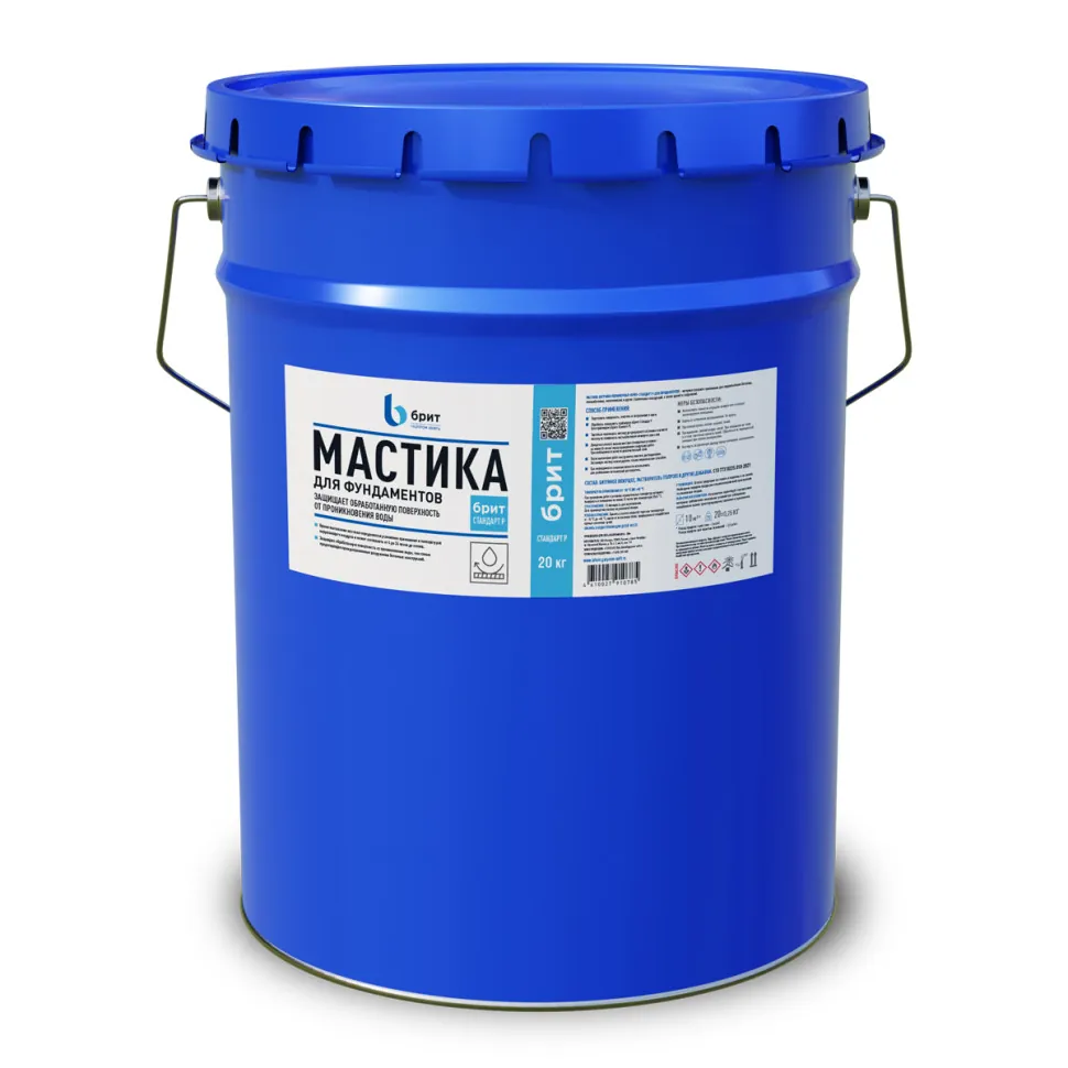 Мастика БРИТ Стандарт Р - однокомпонентный состав холодного применения на основе битума, содержит полимерную композицию, технологические добавки и органический растворитель. Применяется для обмазочной гидроизоляции различных элементов строительных конструкций - фундаментов, подвалов, цокольных этажей. Материал всесезонного применения, обеспечивает надёжную защиту высокопрочным, бесшовным гидроизоляционным покрытием, имеет высокую пропитывающую способность, может использоваться на сложных основаниях. Густая тиксотропная консистенция материала позволяет использовать его для герметизации вертикальных и наклонных поверхностей. Работает на большинстве видов строительных оснований, демонстрируя превосходную адгезию (с бетоном - не менее 0.1 мПа, с металлом - не менее 0.2 мПа). Материал легко наносится, после полного высыхания образует эластичную плёнку (относительное удлинение при разрыве не менее 100%), устойчивую к воздействию грунтовых вод, значительно повышая срок службы объектов.