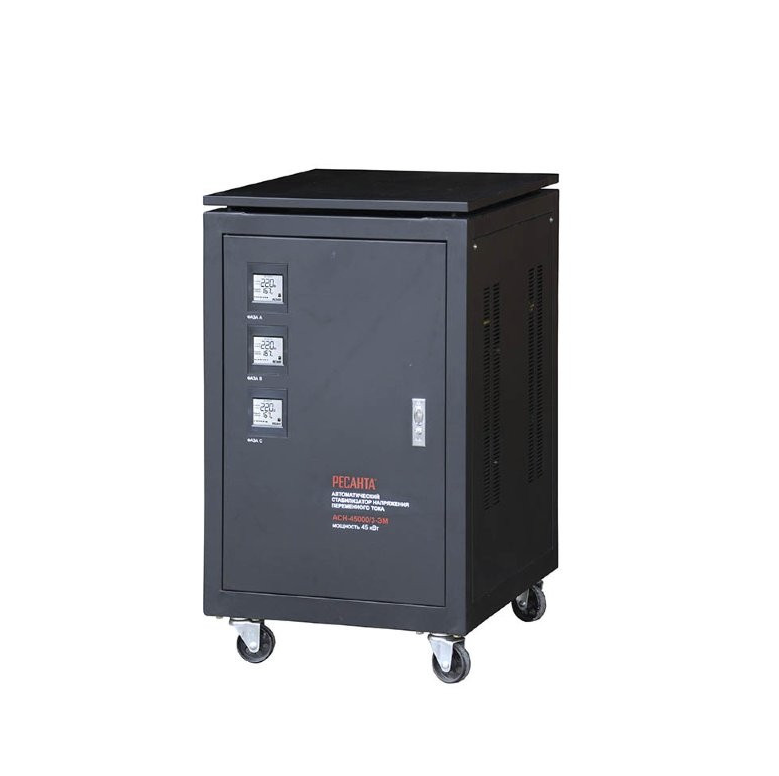 Стабилизатор напряжения РЕСАНТА АСН-45000/3-ЭМ электромеханического типа предназначен для выравнивания входного напряжения и защиты приборов от перепадов напряжения с суммарной мощностью до 45 кВт. Работает с напряжением 380В с точностью до +/-2%. Устройство оснащено фильтрами сетевых помех, предотвращающими искажение частотной синусоиды, микропроцессорным управлением и стрелочной индикацией, отображающей параметры напряжения. Превышение пределов поддерживаемого входного напряжения автоматически отключает подачу питания. Прочный корпус защищает внутренние узлы аппарата от повреждений. Прибор может обеспечивать стабильным питанием частные дома, производственные и офисные здания.