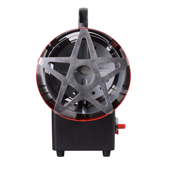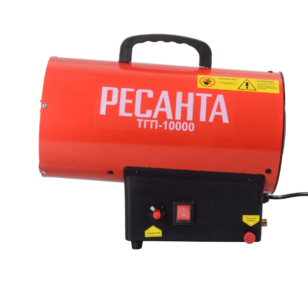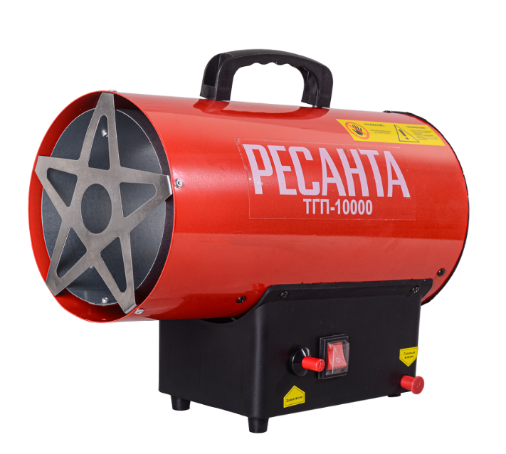 Быстро обогреть помещение, площадь которого составляет до 100м², затратив при этом минимум топлива можно с помощью газовой тепловой пушки модели ТГП-10000 производства компании Ресанта. Она функционирует на сжиженном газе, баллоны с которым подключаются к теплопушке посредством специального редуктора и шланга, поставляемых в комплекте с агрегатом. Газовая теплопушка абсолютно безопасна при эксплуатации. Сжигание газа происходит внутри устройства с выделением большого количества тепла, а надёжный корпус обеспечивает защиту. Мощность тепловой пушки составляет 10кВт. Расход – 0.8кг/ч. Давление – 0.7бар. Воздушный поток – 300м³/час.