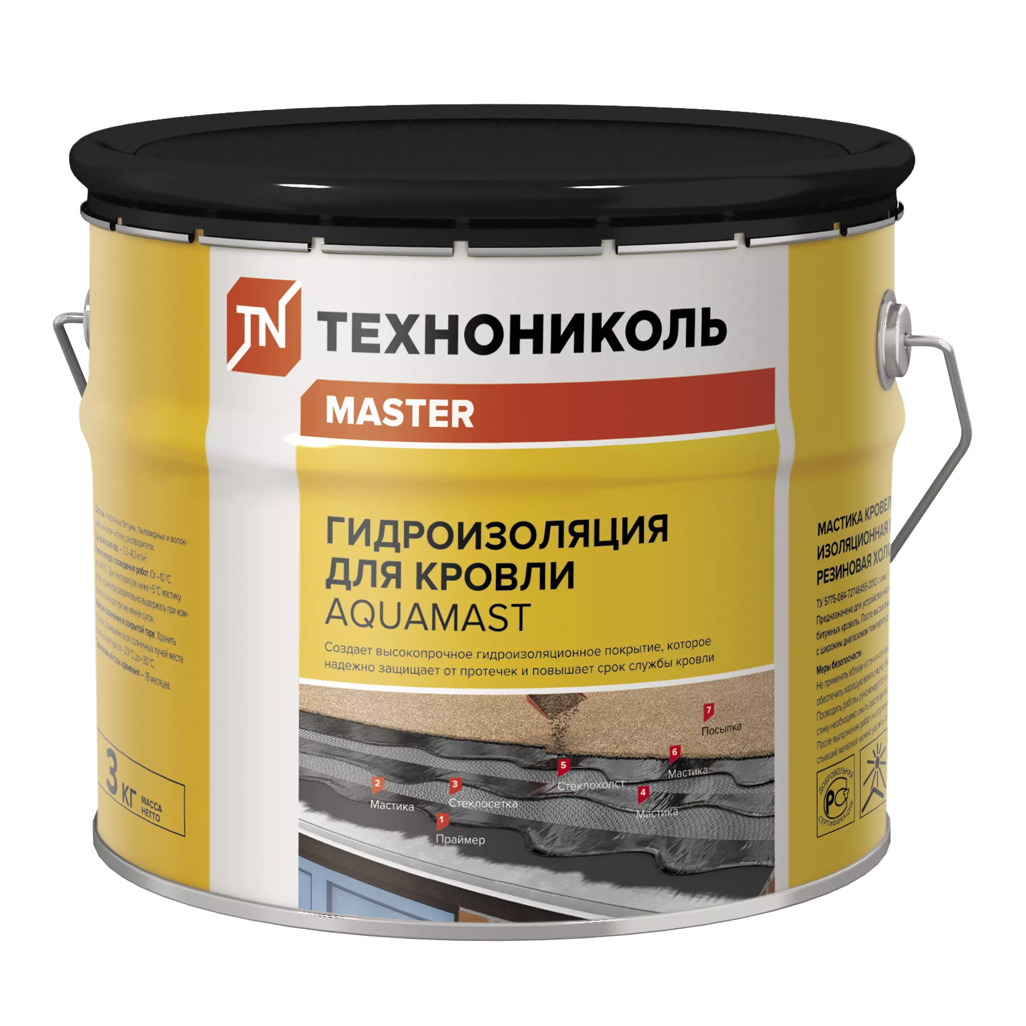 Мастика битумно-резиновая кровельная и гидроизоляционная битумно-резиновая холодная AquaMast представляет собой готовый к применению многокомпонентный материал, состоящий из нефтяного битума, модифицированного дробленой резиной, технологических добавок, минеральных наполнителей и органического растворителя. Предназначена для устройства мастичной и ремонта всех видов кровель. После высыхания образует высокопрочное покрытие с широким диапазоном температур эксплуатации.