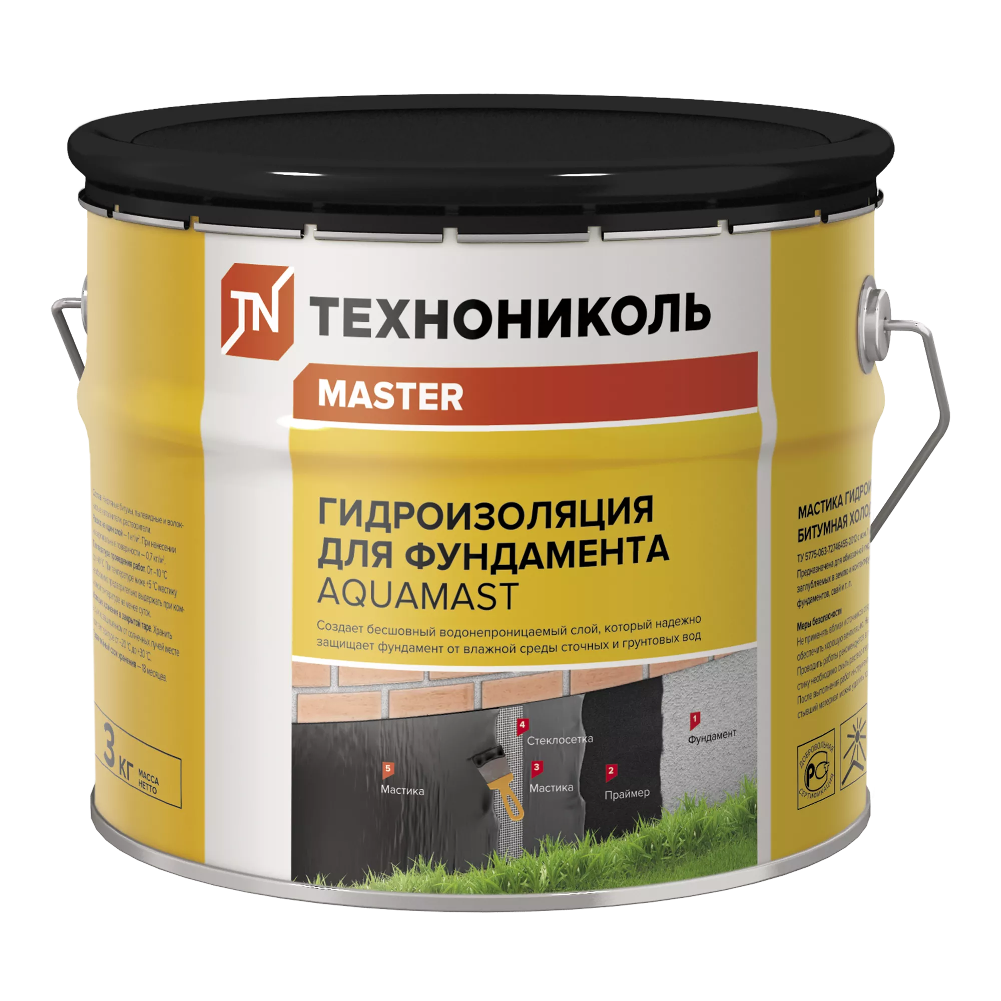 Мастика гидроизоляционная битумная для фундаментов AquaMast представляет собой полностью готовый к применению материал на основе нефтяного битума, содержащий технологические добавки, минеральные наполнители и растворитель. Предназначена для обмазочной гидроизоляции конструкций (бетонных, железобетонных, металлических, деревянных и др.), заглубляемых в землю и контактирующих с влажной средой: фундаментов, свай и т.п.
