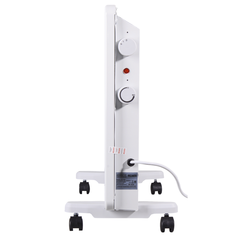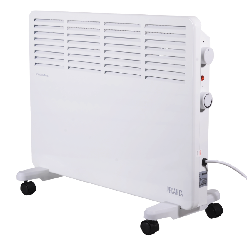 Конвектор РЕСАНТА ОК-1500 на опоре с колёсами устойчив и мобилен. Он дополнительно оснащён терморегулятором, защищающим устройство от перегрева. Данная модель – с механическим управлением.